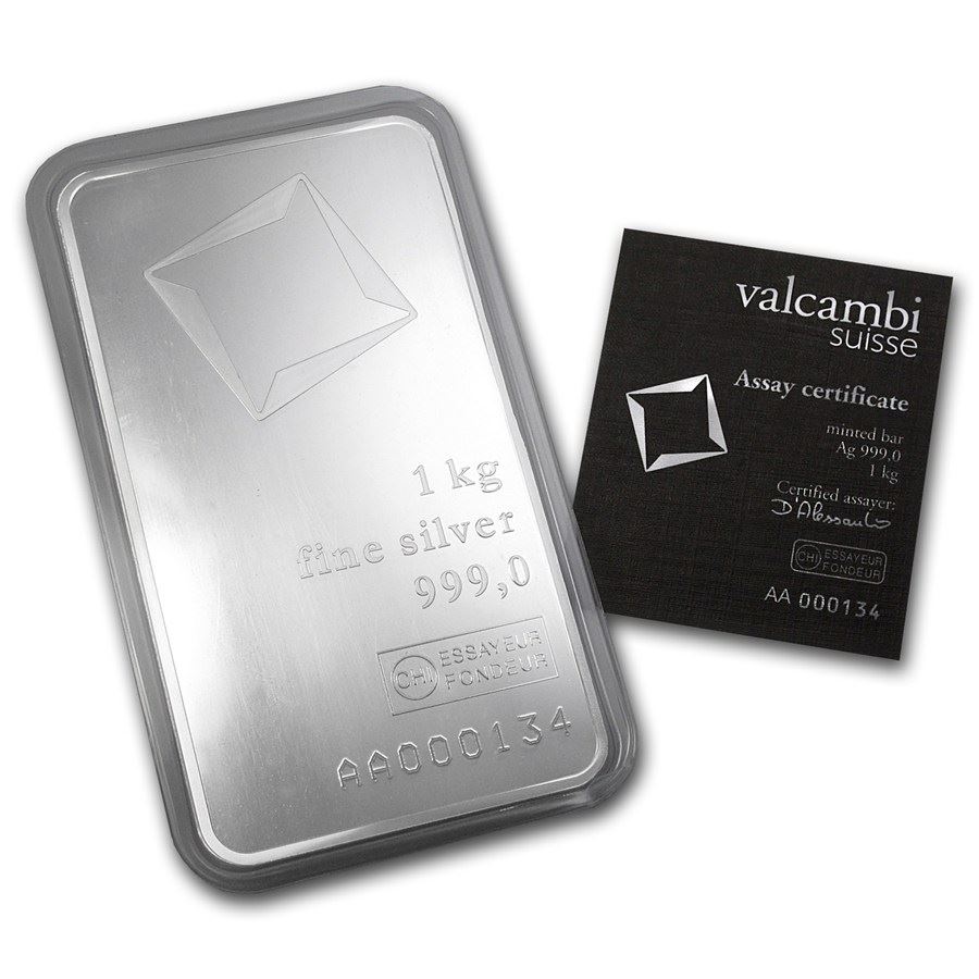 SKU: 78911 - One piece Genuine 1 kilo 0.999 Fine Silver Bar - Valcambi w/ Assay