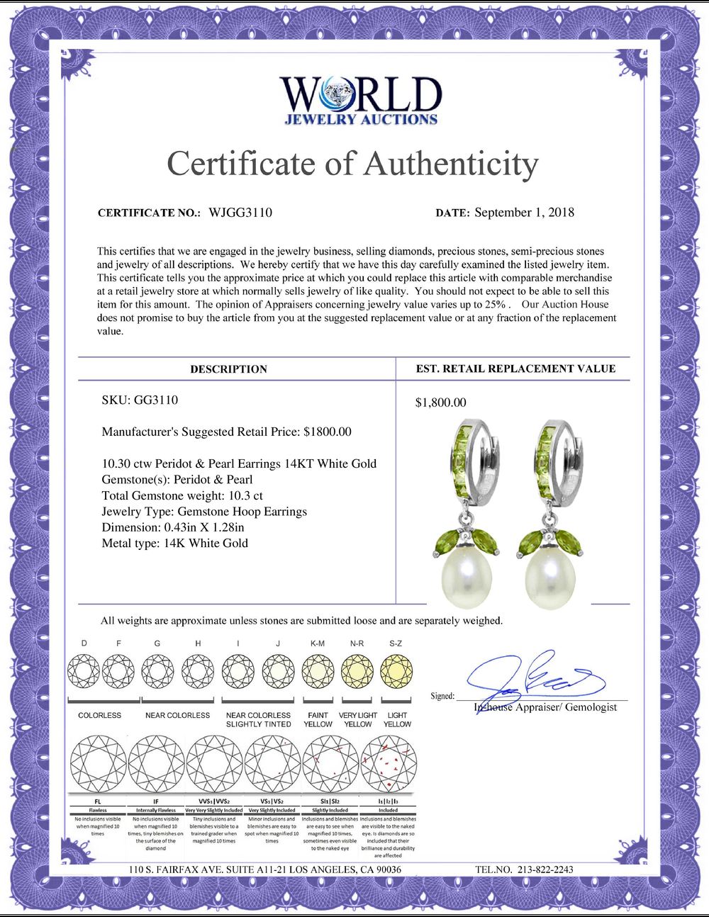 REF-56V7W - SKU: GG3110 ---- Genuine 10.30 ctw Peridot & Pearl Earrings 14KT White Gold