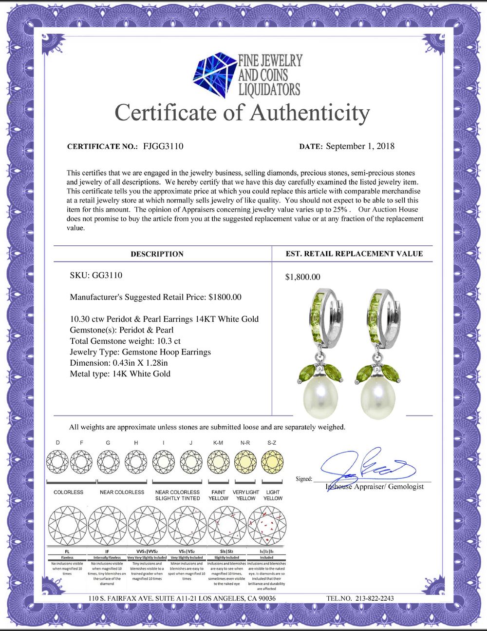REF-56V7W - SKU: GG3110 ---- Genuine 10.30 ctw Peridot & Pearl Earrings 14KT White Gold