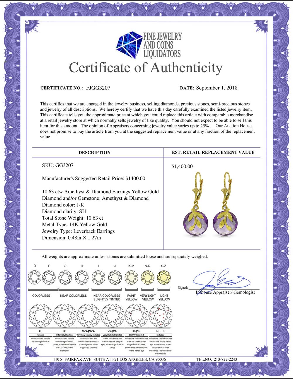 REF-44V7W - SKU: GG3207 ---- Genuine 10.63 ctw Amethyst & Diamond Earrings 14KT Yellow Gold