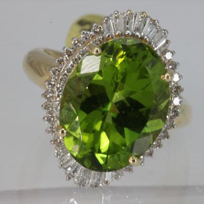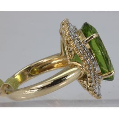 Main Stone: Peridot ; Carat Weight: 10.64ctw ; Gold Carat:14KT; Metal: Yellow Gold ; Ring Size: 6.5 ; Diamond Count: TD.22/RD.38 ; Diamond Weight: 1.28 ; Gemstone Carat Weight: 9.36; Cut: OVAL