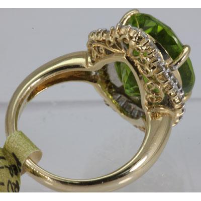 Main Stone: Peridot ; Carat Weight: 10.64ctw ; Gold Carat:14KT; Metal: Yellow Gold ; Ring Size: 6.5 ; Diamond Count: TD.22/RD.38 ; Diamond Weight: 1.28 ; Gemstone Carat Weight: 9.36; Cut: OVAL