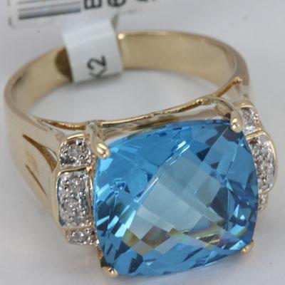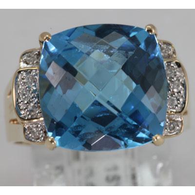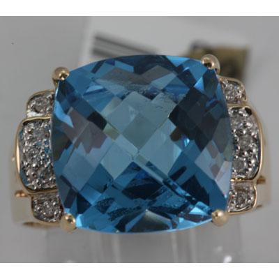 Gemstone: Blue Topaz ; Diamond Count 1: 10RD ; Diamond Weight: 0.06 ; Gemstone Color: Blue ; Gemstone Count: 1 Cushion Cut ; Gemstone Weight: 10.81 ; Dimension: 13X13MM ; Metal Purity: 14KT ; Metal: Gold-Yellow ; Ring Size: 7