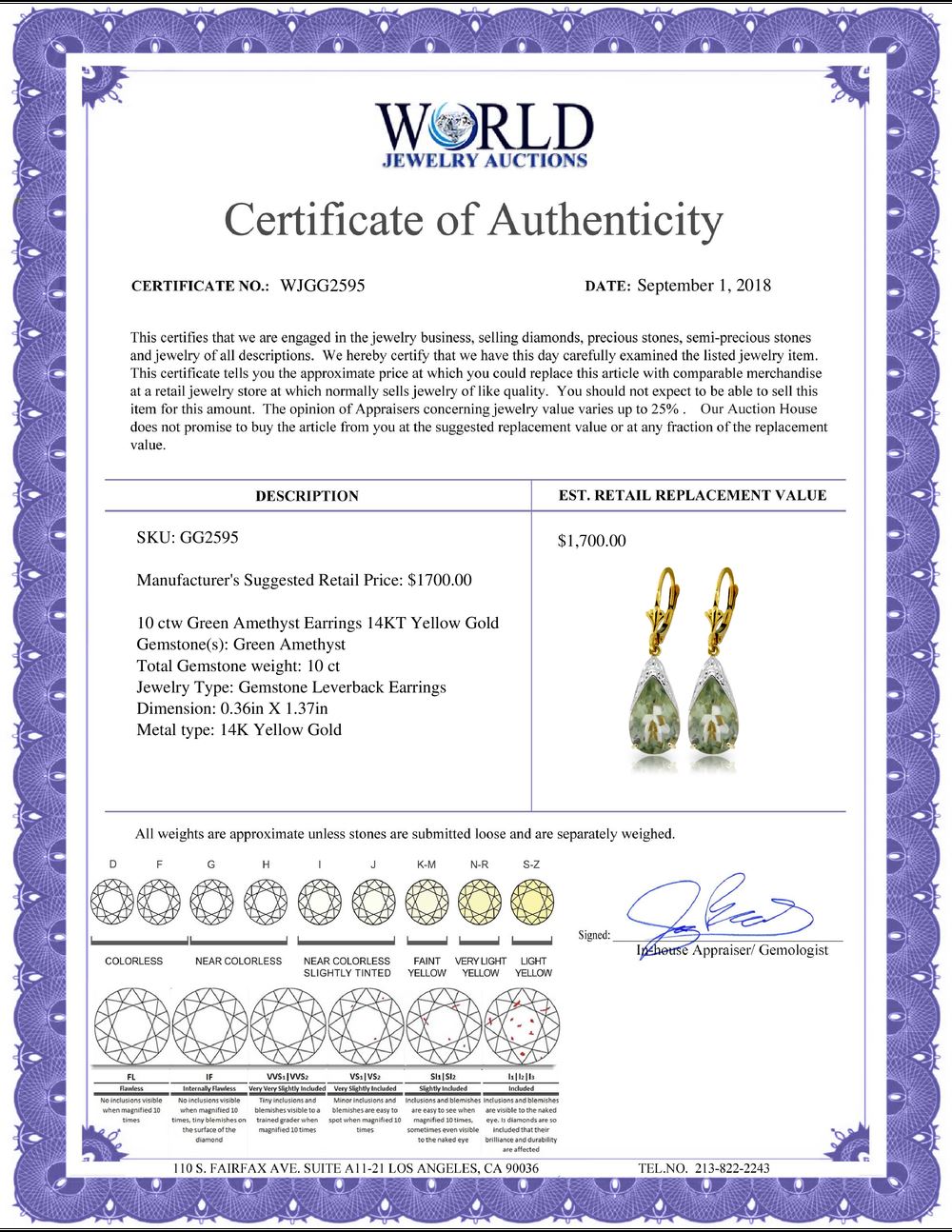 REF-55Y5F - SKU: GG2595 ---- Genuine 10 ctw Green Amethyst Earrings 14KT Yellow Gold