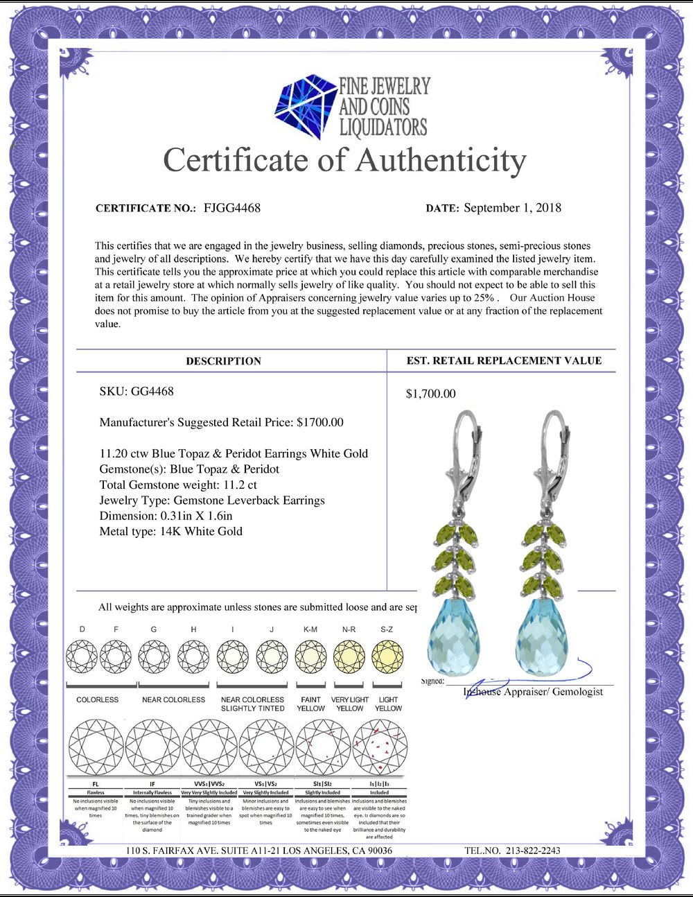 REF-56F2Z - SKU: GG4468 ---- Genuine 11.20 ctw Blue Topaz & Peridot Earrings 14KT White Gold