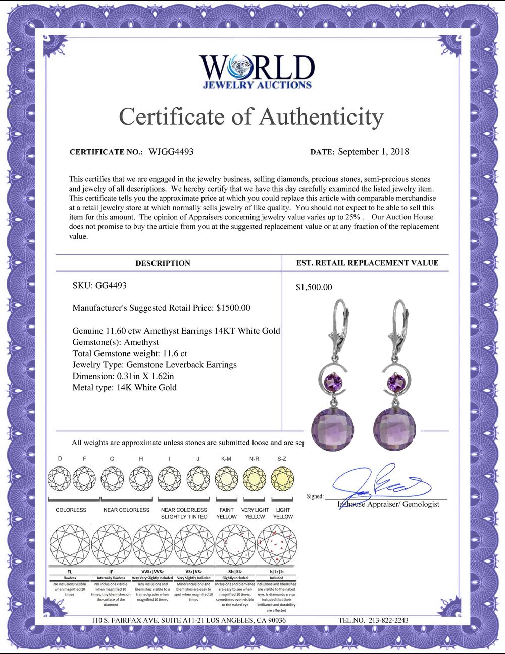 All property is sold “AS IS”, and ALL SALES ARE FINAL. Property is open to thorough public inspection. It is the Bidder’s responsibility to determine condition, age, genuineness, value or any other determinative factor. WJA may attempt to describe the merchandise in advertising and on the Internet but makes no representations. In no event shall WORLD JEWELRY AUCTION be held responsible for having made or implied any warranty of merchantability or fitness for a particular purpose. Bidder shall be the sole judge of value.