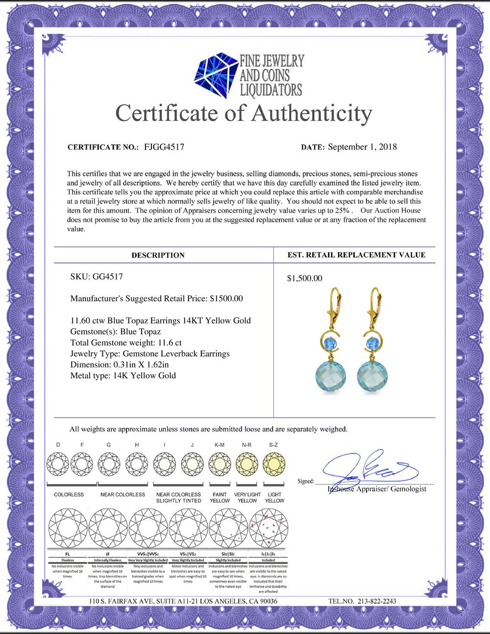 REF-47R5P - SKU: GG4517 ---- Genuine 11.60 ctw Blue Topaz Earrings 14KT Yellow Gold