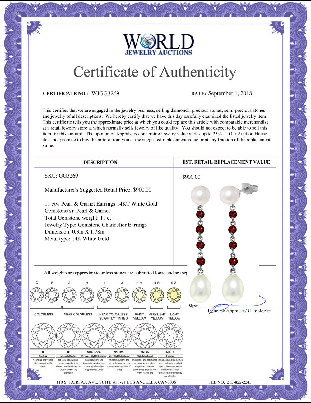 WORLD JEWELRY AUCTION believes to the best of its knowledge that the information presented in any listing has come from reliable sources. Such information is presented solely for the convenience of the Purchaser. WJA makes no warranties of any kind related to the information presented in any listing. WJA further makes no warranties, either express or implied, relating to the value, marketability or condition of the lot described in any listing. Prospective bidders should investigate a lot thoroughly before bidding. By bidding the Bidder acknowledges that Bidder has investigated the lot to his or her satisfaction, or, that Bidder has chosen not to do so, and agrees to accept the lot being bid on with no objections after the sale closes. If you are uncertain please contact us with your questions prior to bidding. If you are still uncertain after we reply, please refrain from bidding. Photos other graphic material contained in any listing of generic or duplicate lots may be stock presentations and not necessarily of the specific lot.