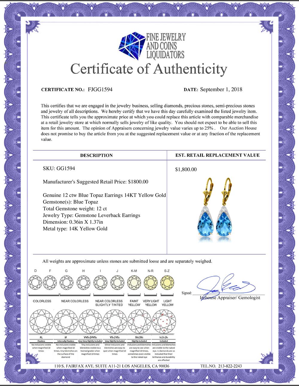 REF-57P6H - SKU: GG1594 ---- Genuine 12 ctw Blue Topaz Earrings 14KT Yellow Gold