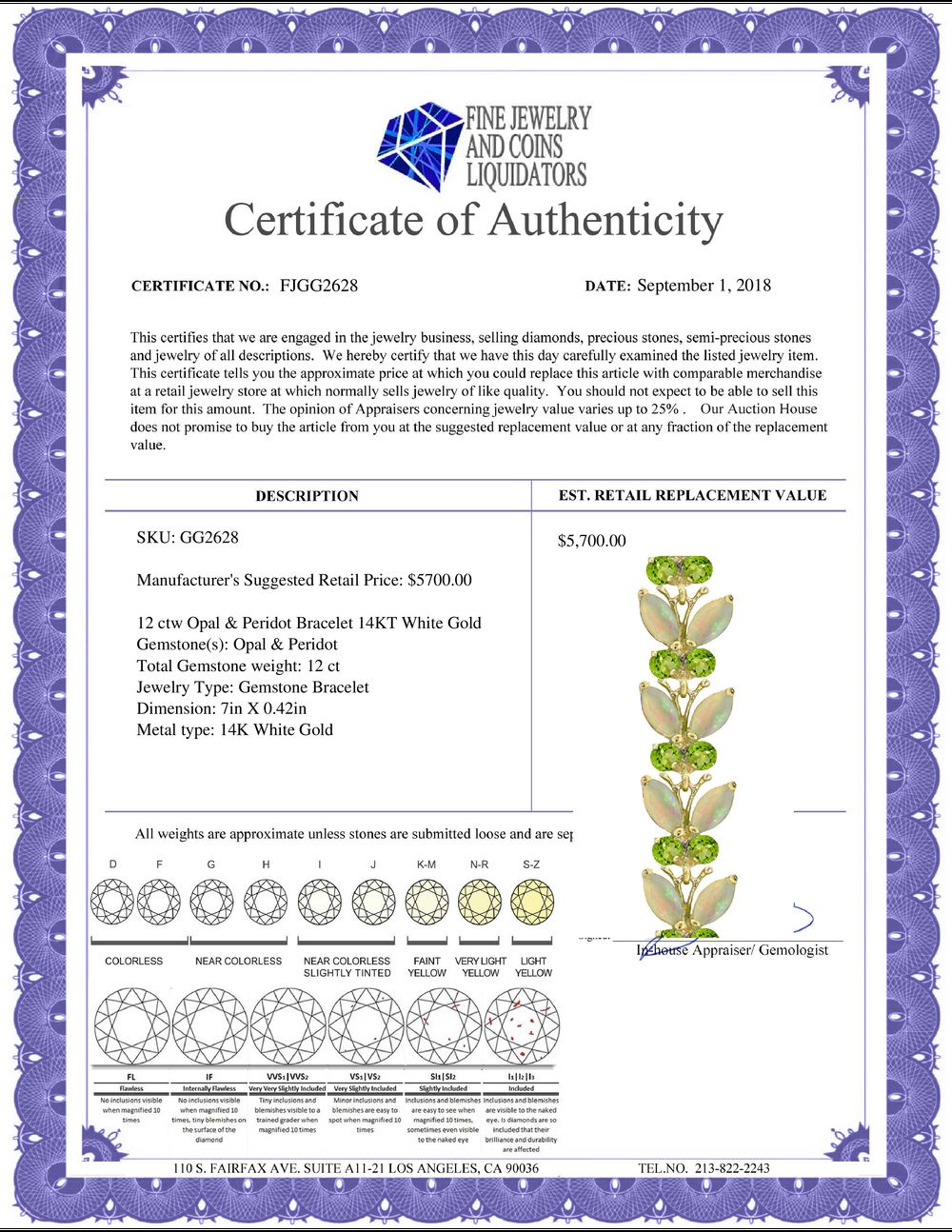 REF-189A3K - SKU: GG2628 ---- Genuine 12 ctw Opal & Peridot Bracelet 14KT White Gold