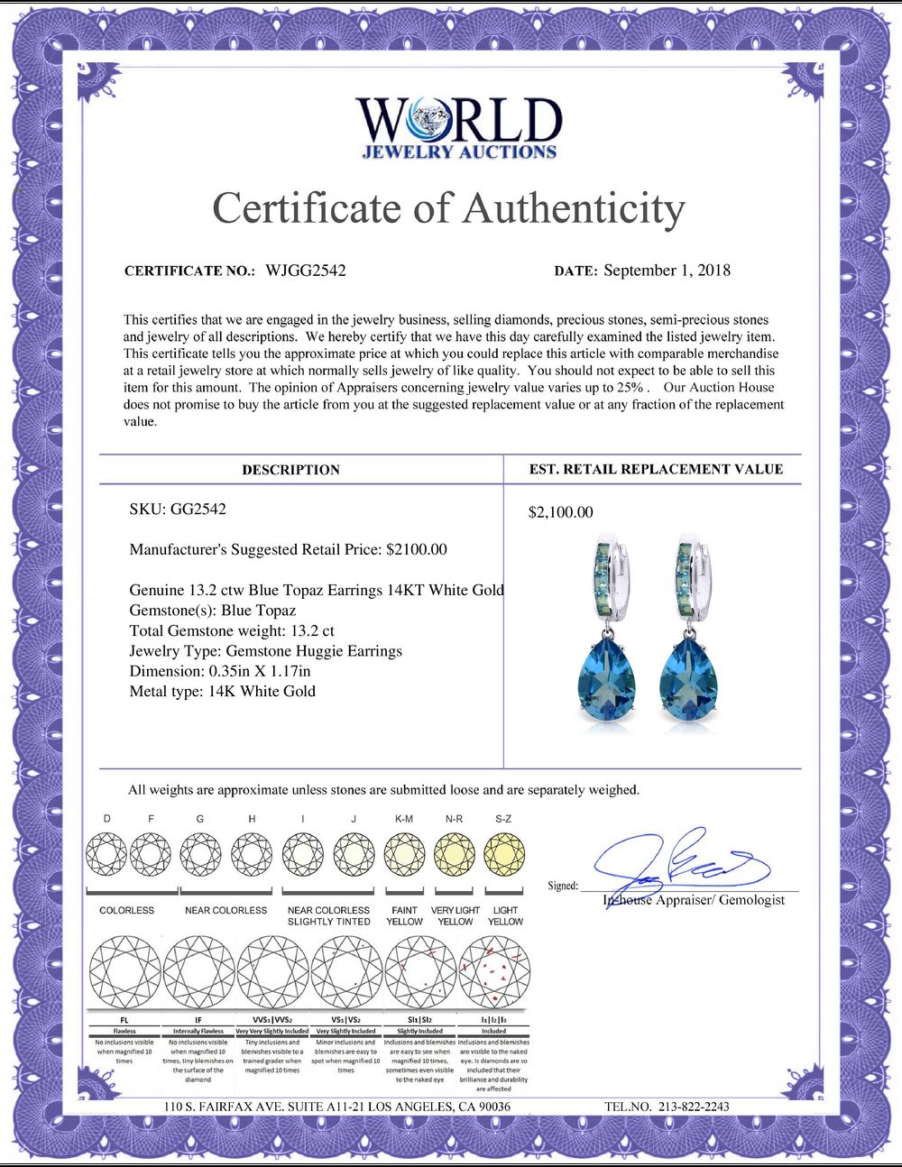 All property is sold “AS IS”, and ALL SALES ARE FINAL. Property is open to thorough public inspection. It is the Bidder’s responsibility to determine condition, age, genuineness, value or any other determinative factor. WJA may attempt to describe the merchandise in advertising and on the Internet but makes no representations. In no event shall WORLD JEWELRY AUCTION be held responsible for having made or implied any warranty of merchantability or fitness for a particular purpose. Bidder shall be the sole judge of value.