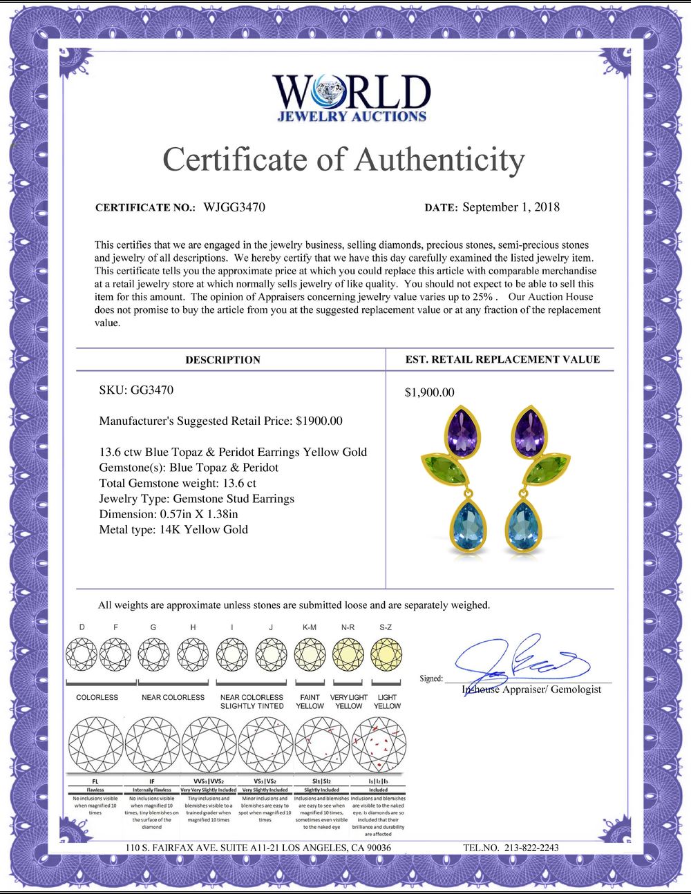 REF-62F4Z - SKU: GG3470 ---- Genuine 13.6 ctw Blue Topaz & Peridot Earrings 14KT Yellow Gold