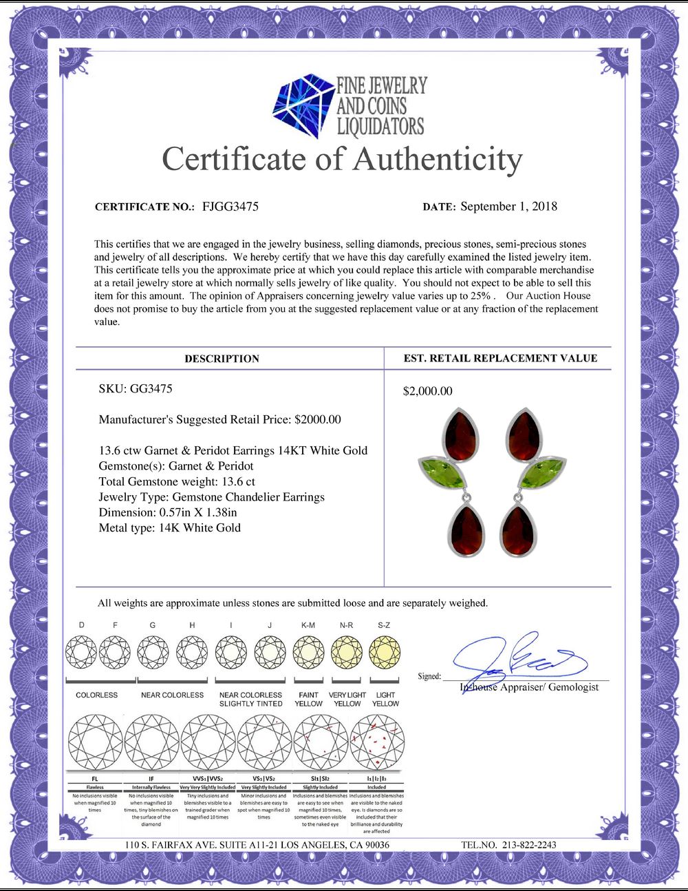 REF-64T4A - SKU: GG3475 ---- Genuine 13.6 ctw Garnet & Peridot Earrings 14KT White Gold
