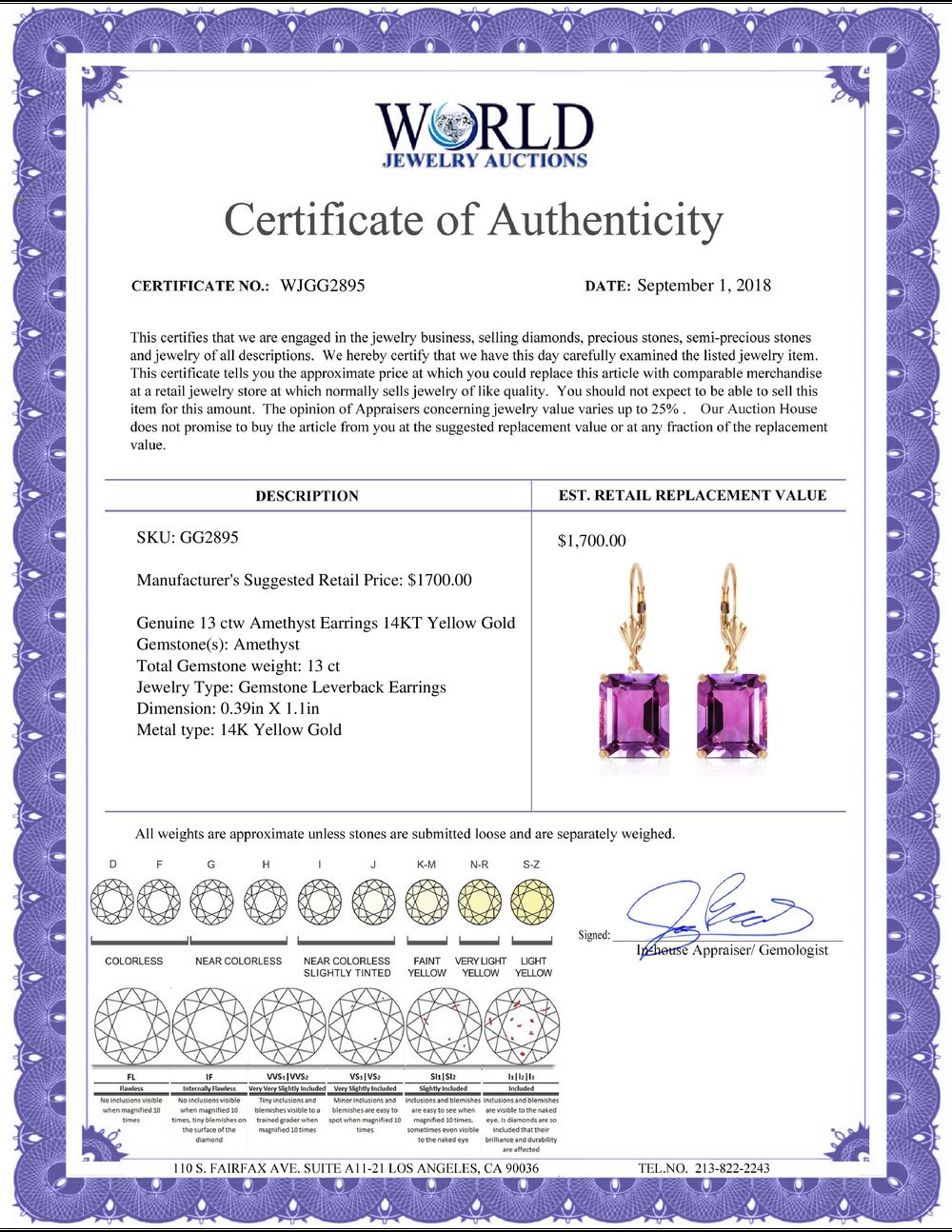 REF-54W2Y - SKU: GG2895 ---- Genuine 13 ctw Amethyst Earrings 14KT Yellow Gold