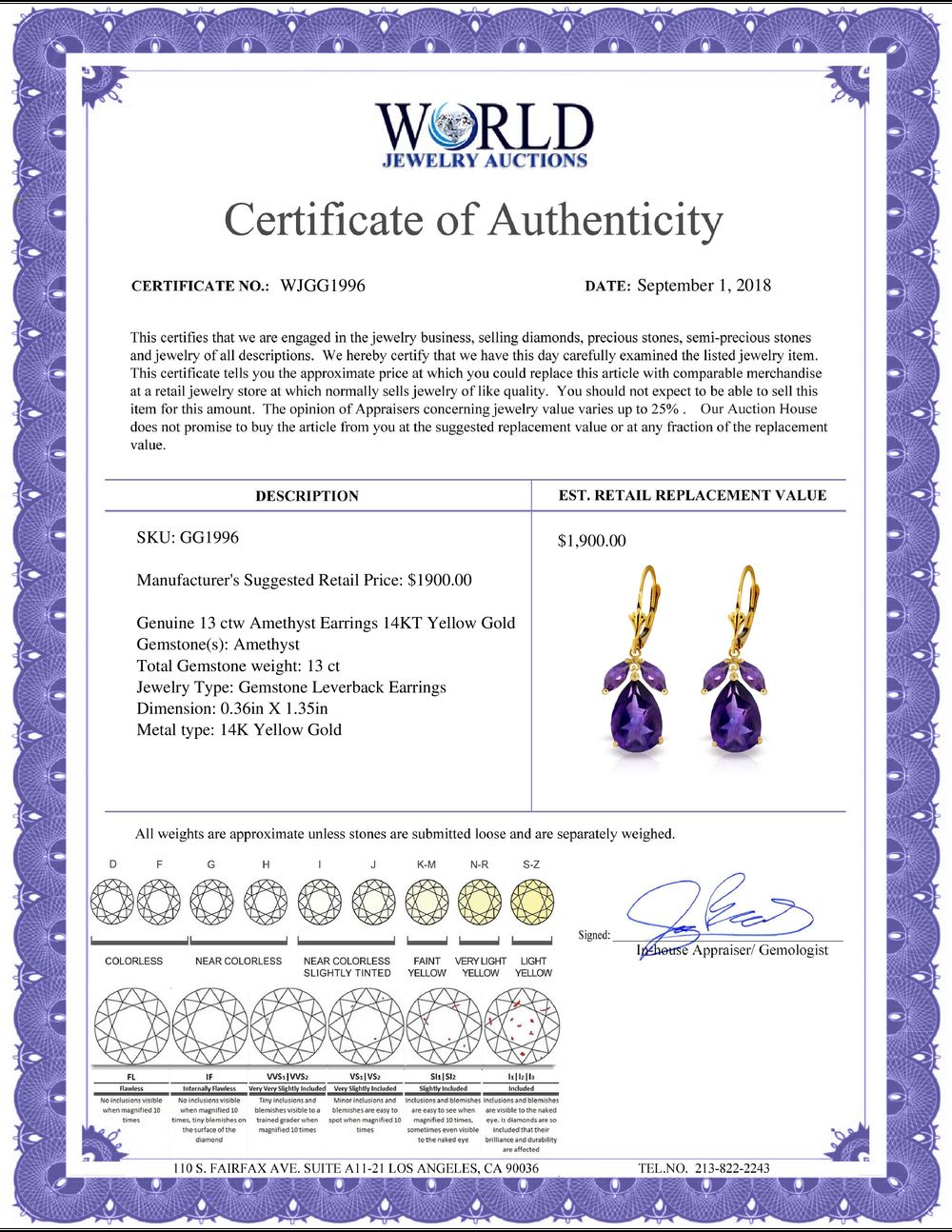 REF-61W2Y - SKU: GG1996 ---- Genuine 13 ctw Amethyst Earrings 14KT Yellow Gold