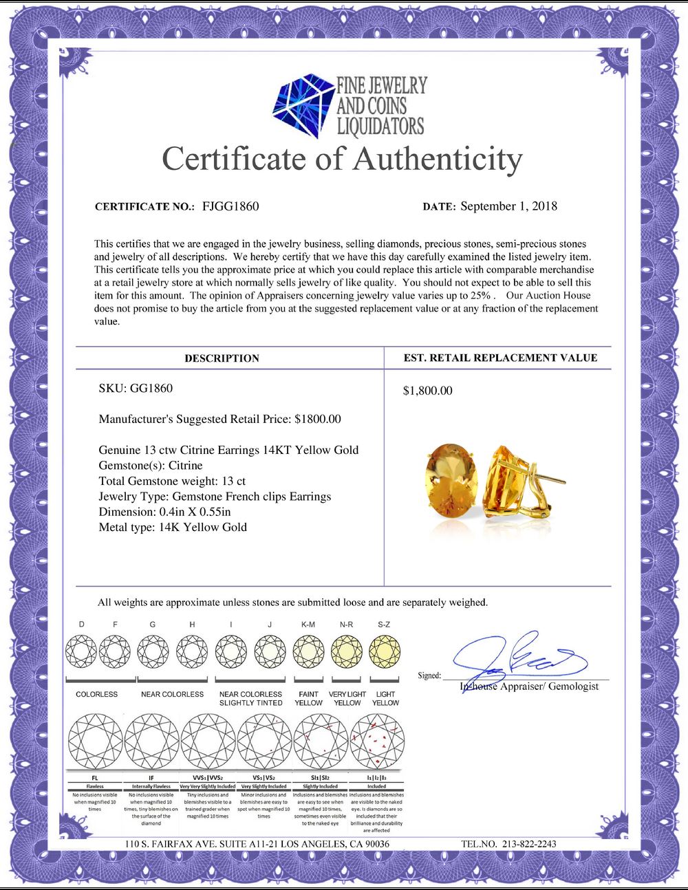 REF-57K3V - SKU: GG1860 ---- Genuine 13 ctw Citrine Earrings 14KT Yellow Gold