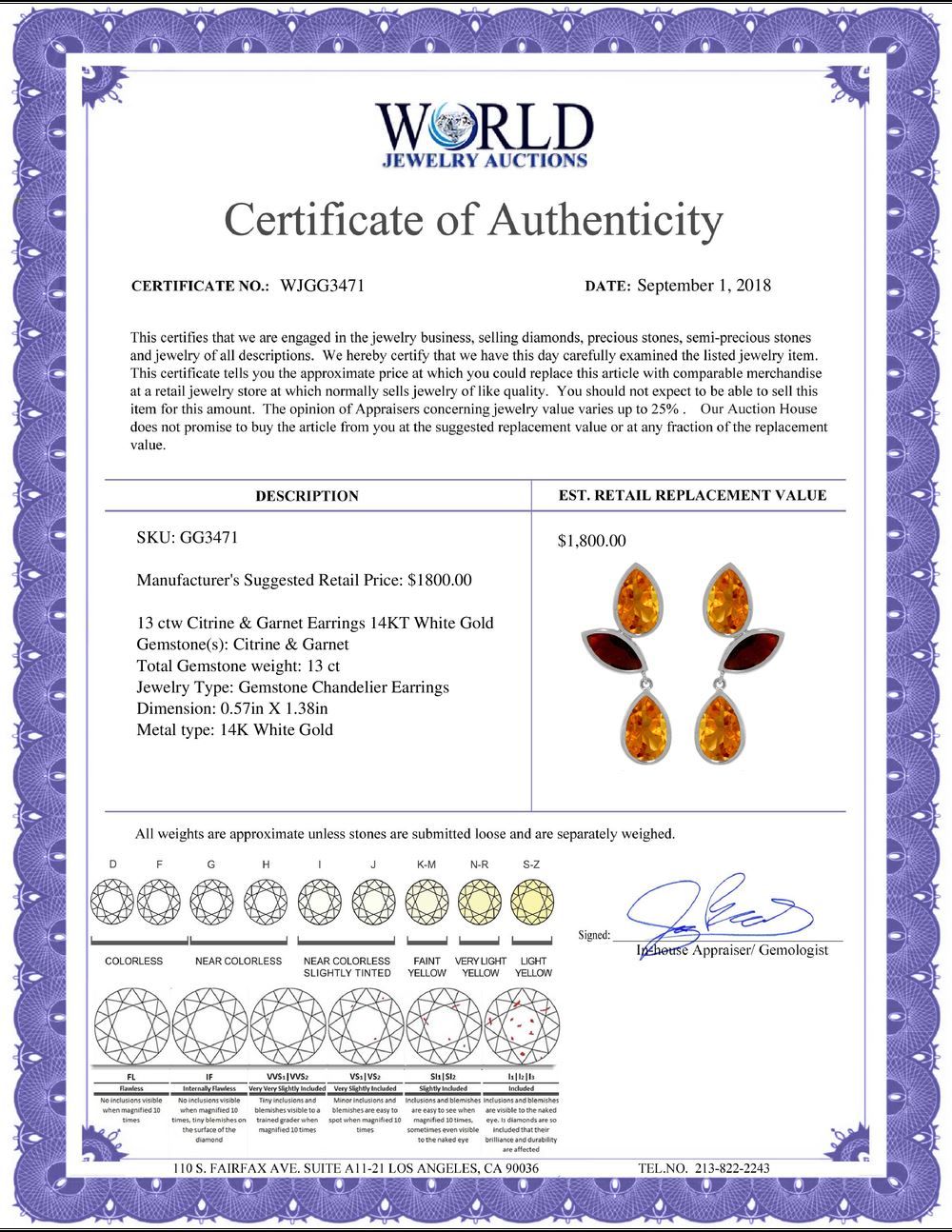 All property is sold “AS IS”, and ALL SALES ARE FINAL. Property is open to thorough public inspection. It is the Bidder’s responsibility to determine condition, age, genuineness, value or any other determinative factor. WJA may attempt to describe the merchandise in advertising and on the Internet but makes no representations. In no event shall WORLD JEWELRY AUCTION be held responsible for having made or implied any warranty of merchantability or fitness for a particular purpose. Bidder shall be the sole judge of value.