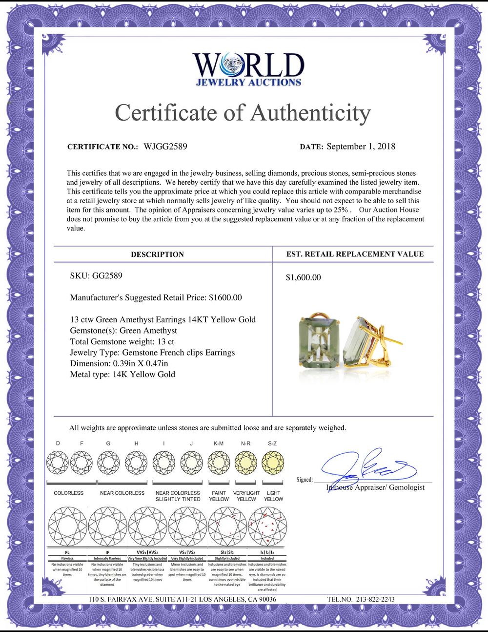 WORLD JEWELRY AUCTION believes to the best of its knowledge that the information presented in any listing has come from reliable sources. Such information is presented solely for the convenience of the Purchaser. WJA makes no warranties of any kind related to the information presented in any listing. WJA further makes no warranties, either express or implied, relating to the value, marketability or condition of the lot described in any listing. Prospective bidders should investigate a lot thoroughly before bidding. By bidding the Bidder acknowledges that Bidder has investigated the lot to his or her satisfaction, or, that Bidder has chosen not to do so, and agrees to accept the lot being bid on with no objections after the sale closes. If you are uncertain please contact us with your questions prior to bidding. If you are still uncertain after we reply, please refrain from bidding. Photos other graphic material contained in any listing of generic or duplicate lots may be stock presentations and not necessarily of the specific lot.