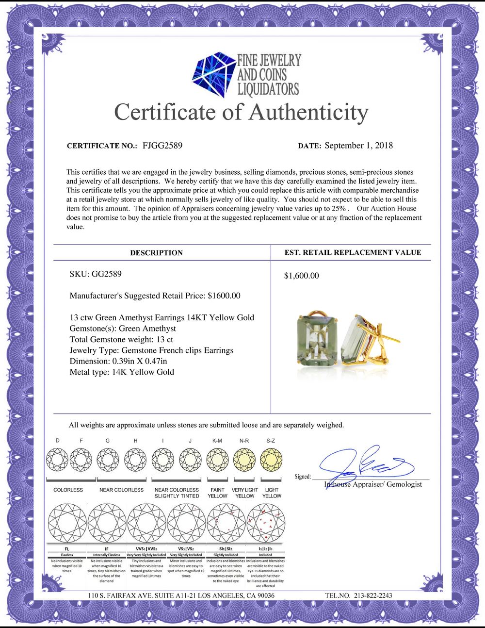 REF-53Y2F - SKU: GG2589 ---- Genuine 13 ctw Green Amethyst Earrings 14KT Yellow Gold