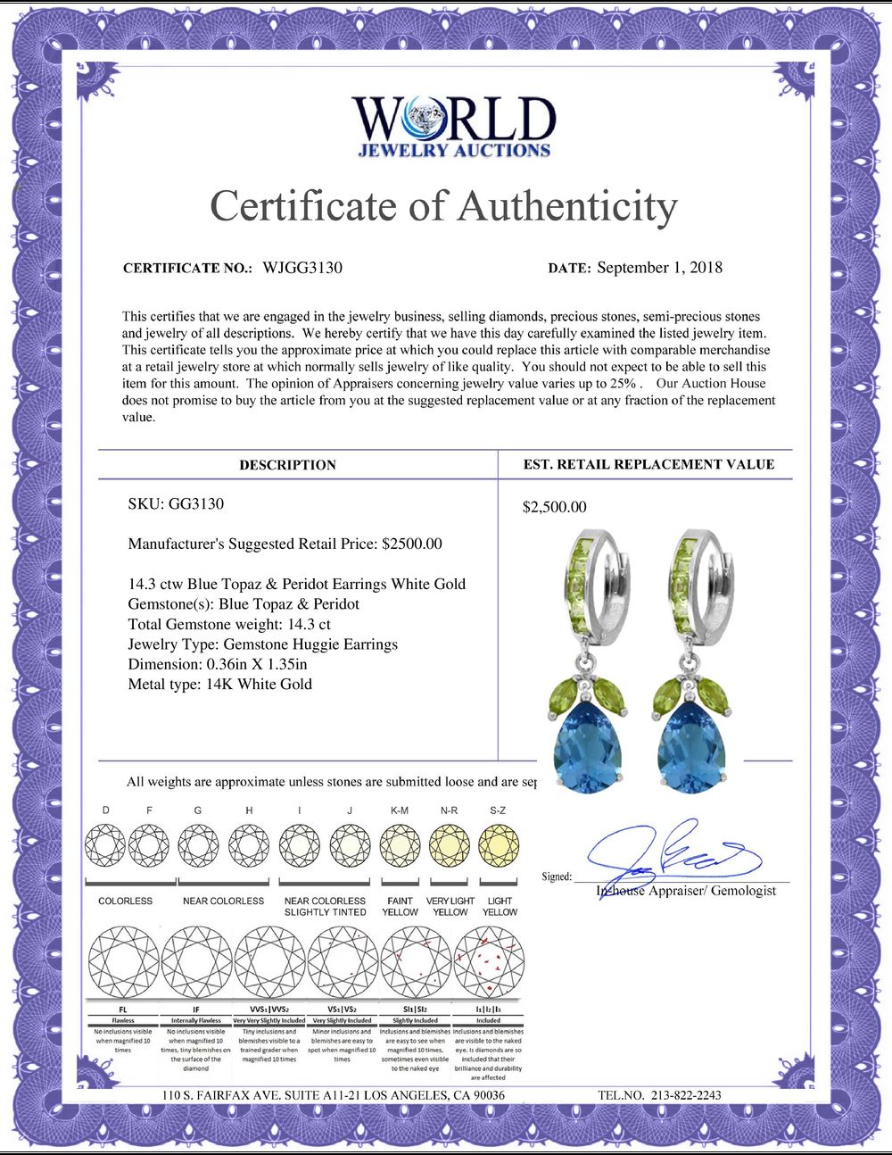All property is sold “AS IS”, and ALL SALES ARE FINAL. Property is open to thorough public inspection. It is the Bidder’s responsibility to determine condition, age, genuineness, value or any other determinative factor. WJA may attempt to describe the merchandise in advertising and on the Internet but makes no representations. In no event shall WORLD JEWELRY AUCTION be held responsible for having made or implied any warranty of merchantability or fitness for a particular purpose. Bidder shall be the sole judge of value.