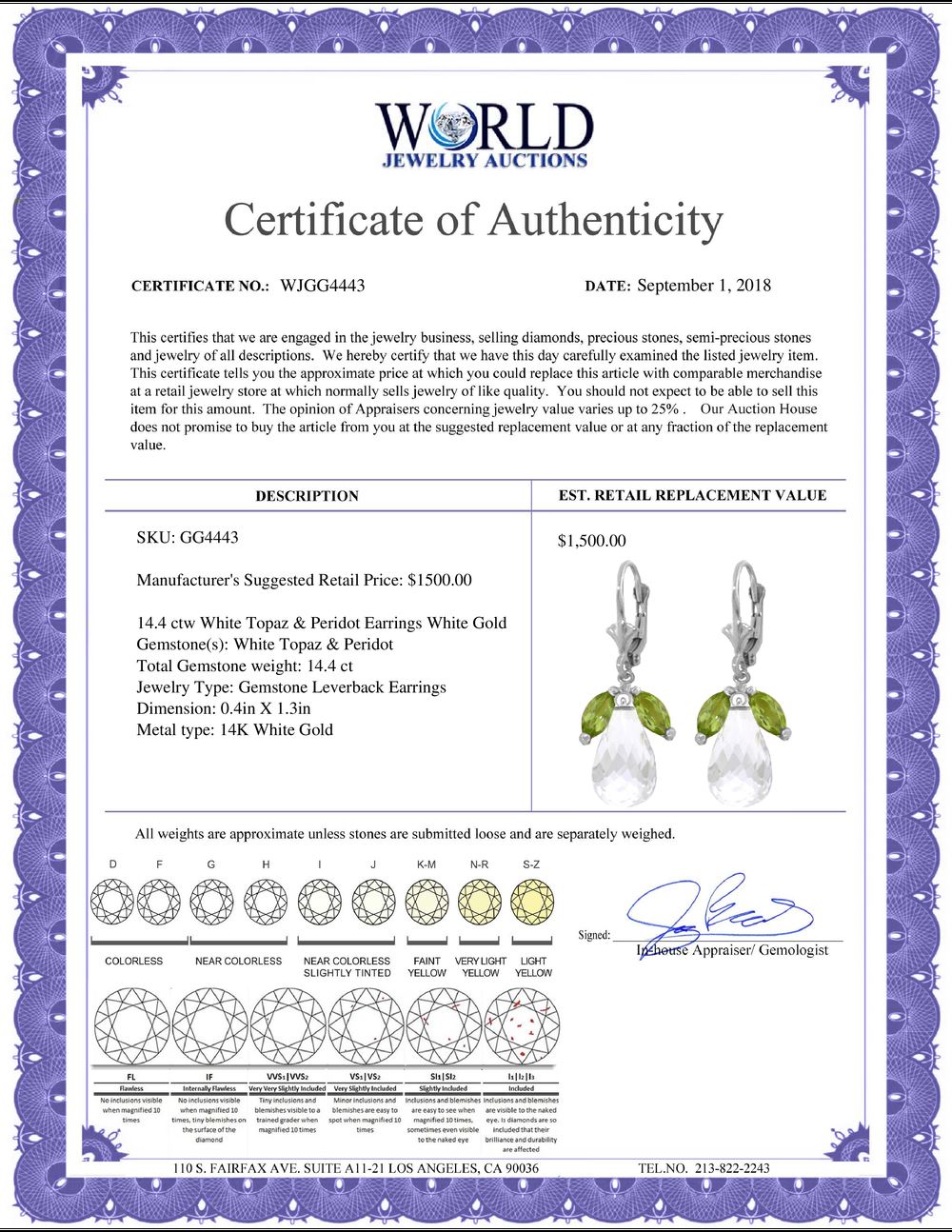 REF-46K7V - SKU: GG4443 ---- Genuine 14.4 ctw White Topaz & Peridot Earrings 14KT White Gold