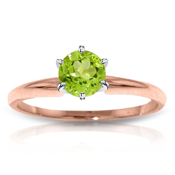 One gemologically tested 14KT Rose Gold 0.65 ctw Peridot Ring ---- Mounted stone(s): Peridot ---- Total Gemstone weight: 0.65 ct ---- Jewelry type: Gemstone Ring ---- Jewelry Dimension: 0.23in (5.8mm) x 0.99in (25.1mm) ---- Metal type: 14KT Rose Gold ----- Ring size: 6.5 (US) ---- Product - SKU#-JGG72843
