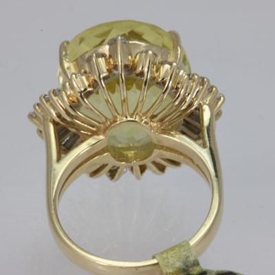 Main Stone: Lemon Quartz ; Carat Weight: 15.14ctw ; Gold Carat:14KT; Metal: Yellow Gold ; Ring Size: 5.75 ; Diamond Weight: 0.37 ; Gemstone Carat Weight: 14.77; Cut: OVAL