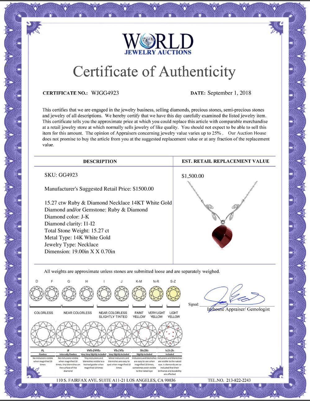 WORLD JEWELRY AUCTION believes to the best of its knowledge that the information presented in any listing has come from reliable sources. Such information is presented solely for the convenience of the Purchaser. WJA makes no warranties of any kind related to the information presented in any listing. WJA further makes no warranties, either express or implied, relating to the value, marketability or condition of the lot described in any listing. Prospective bidders should investigate a lot thoroughly before bidding. By bidding the Bidder acknowledges that Bidder has investigated the lot to his or her satisfaction, or, that Bidder has chosen not to do so, and agrees to accept the lot being bid on with no objections after the sale closes. If you are uncertain please contact us with your questions prior to bidding. If you are still uncertain after we reply, please refrain from bidding. Photos other graphic material contained in any listing of generic or duplicate lots may be stock presentations and not necessarily of the specific lot.