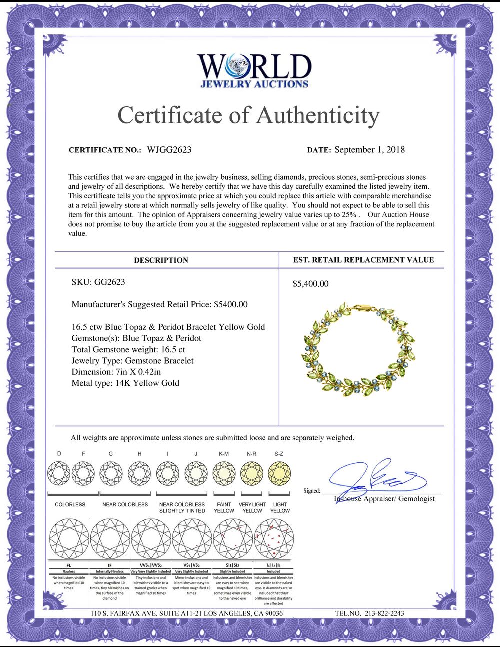 REF-179Z2N - SKU: GG2623 ---- Genuine 16.5 ctw Blue Topaz & Peridot Bracelet 14KT Yellow Gold