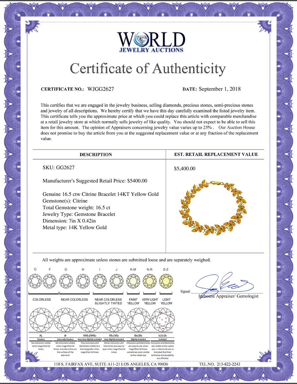 REF-179K2V - SKU: GG2627 ---- Genuine 16.5 ctw Citrine Bracelet 14KT Yellow Gold