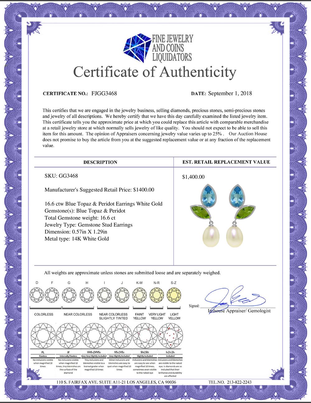 REF-45M7T - SKU: GG3468 ---- Genuine 16.6 ctw Blue Topaz & Peridot Earrings 14KT White Gold