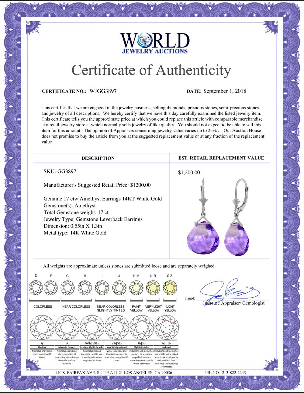 All property is sold “AS IS”, and ALL SALES ARE FINAL. Property is open to thorough public inspection. It is the Bidder’s responsibility to determine condition, age, genuineness, value or any other determinative factor. WJA may attempt to describe the merchandise in advertising and on the Internet but makes no representations. In no event shall WORLD JEWELRY AUCTION be held responsible for having made or implied any warranty of merchantability or fitness for a particular purpose. Bidder shall be the sole judge of value.