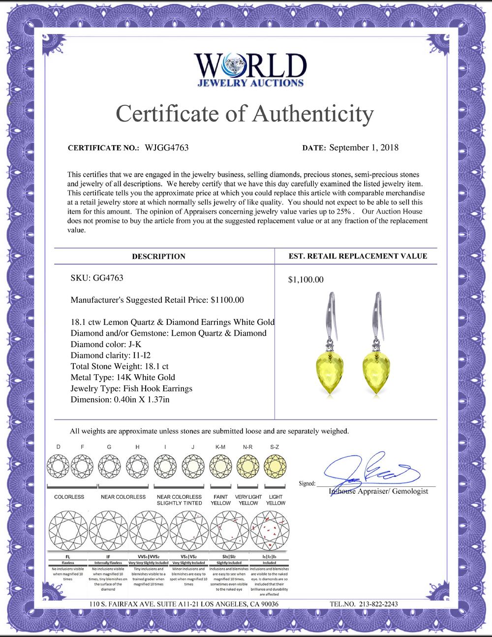 REF-35H2X - SKU: GG4763 ---- Genuine 18.1 ctw Lemon Quartz & Diamond Earrings 14KT White Gold