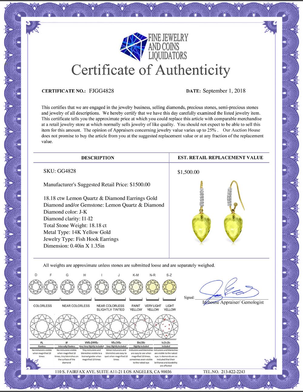 REF-46F7Z - SKU: GG4828 ---- Genuine 18.18 ctw Lemon Quartz & Diamond Earrings 14KT Yellow Gold