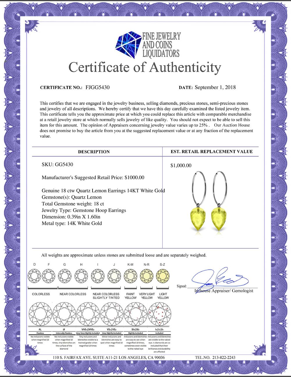REF-32N4R - SKU: GG5430 ---- Genuine 18 ctw Quartz Lemon Earrings 14KT White Gold