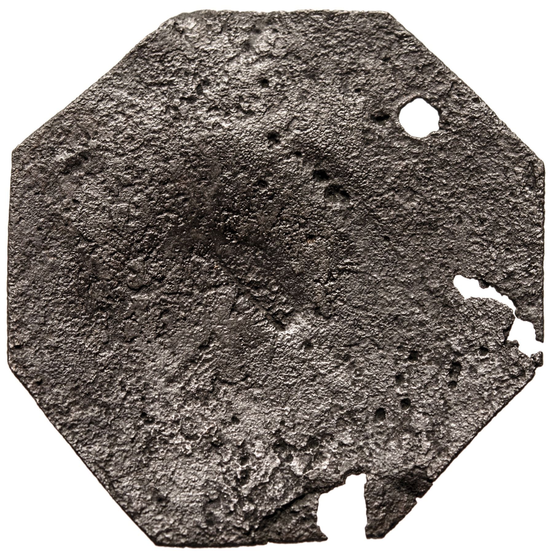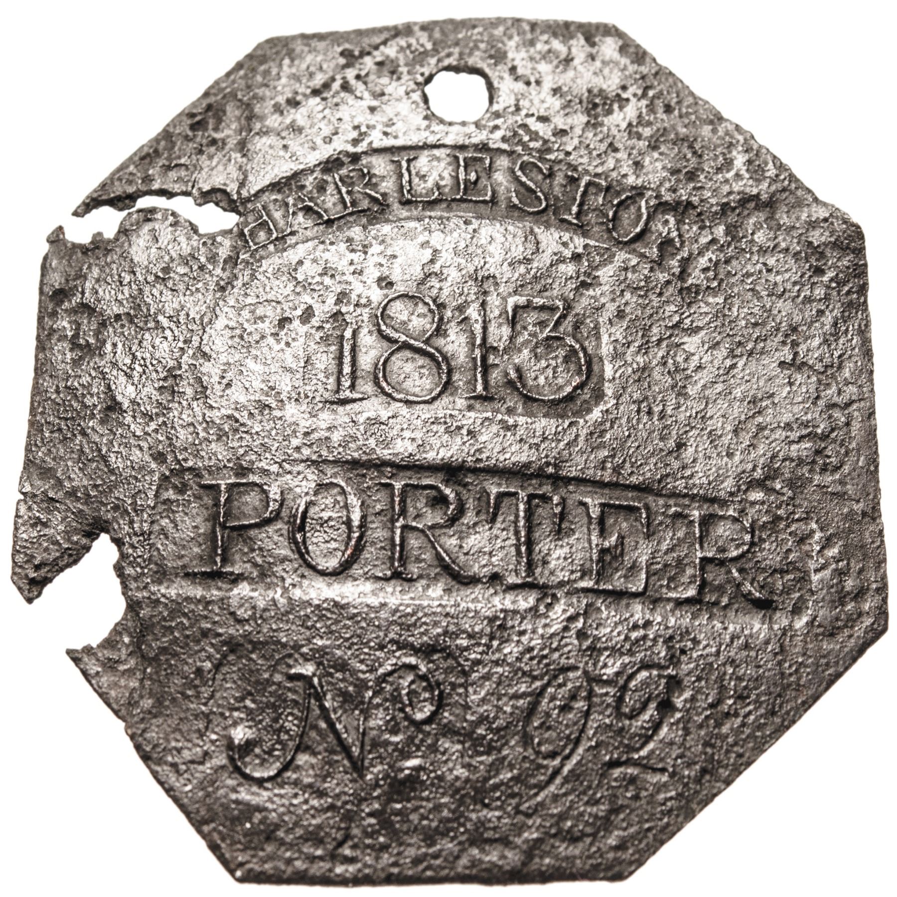 This rare, fully Genuine and authentic 1813 “PORTER” Slave Identification Tag is hallmark punched by its maker “LAFAR” on the center of its reverse side and measures about 2” x 2”, is octagon shaped and holed at top for suspension, as always. There is metal loss as shown along the left side with two small chips in the metal, the top one touching just above “CH” of CHARLESTON while the lower is far from any text. Its deep brown surfaces are slightly rough overall yet all of the text and details on its face side are defined and very clear. The central reverse hallmark punch “LAFAR” is only partially apparent  having been obscured by surface porosity. This early genuine Slave Hire Tag reads: “CHARLESTON / 1813 / PORTER / No 92”, made by J.J. Lafar who was hired by the city as the only Slave Tag maker at the time.
