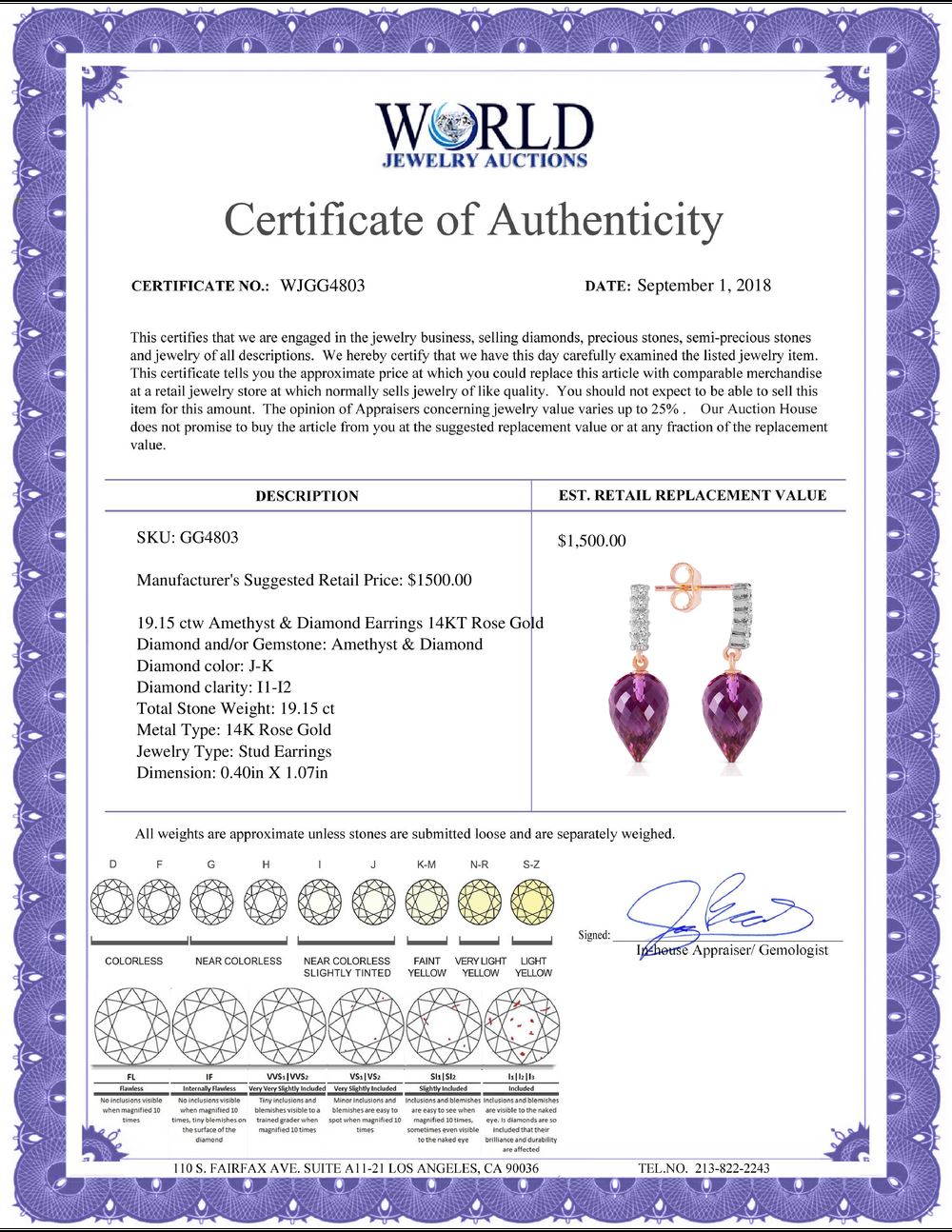 WORLD JEWELRY AUCTION believes to the best of its knowledge that the information presented in any listing has come from reliable sources. Such information is presented solely for the convenience of the Purchaser. WJA makes no warranties of any kind related to the information presented in any listing. WJA further makes no warranties, either express or implied, relating to the value, marketability or condition of the lot described in any listing. Prospective bidders should investigate a lot thoroughly before bidding. By bidding the Bidder acknowledges that Bidder has investigated the lot to his or her satisfaction, or, that Bidder has chosen not to do so, and agrees to accept the lot being bid on with no objections after the sale closes. If you are uncertain please contact us with your questions prior to bidding. If you are still uncertain after we reply, please refrain from bidding. Photos other graphic material contained in any listing of generic or duplicate lots may be stock presentations and not necessarily of the specific lot.