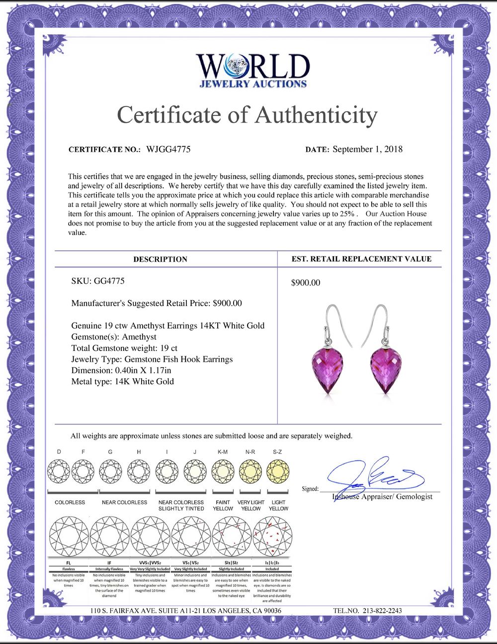 WORLD JEWELRY AUCTION believes to the best of its knowledge that the information presented in any listing has come from reliable sources. Such information is presented solely for the convenience of the Purchaser. WJA makes no warranties of any kind related to the information presented in any listing. WJA further makes no warranties, either express or implied, relating to the value, marketability or condition of the lot described in any listing. Prospective bidders should investigate a lot thoroughly before bidding. By bidding the Bidder acknowledges that Bidder has investigated the lot to his or her satisfaction, or, that Bidder has chosen not to do so, and agrees to accept the lot being bid on with no objections after the sale closes. If you are uncertain please contact us with your questions prior to bidding. If you are still uncertain after we reply, please refrain from bidding. Photos other graphic material contained in any listing of generic or duplicate lots may be stock presentations and not necessarily of the specific lot.