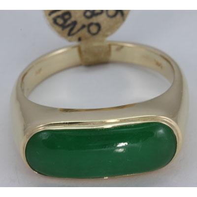 Gemstone: 19X8MM Green Jade ; Gemstone Color: Green ; Gemstone Count: 1 Long Cushion ; Dimension: 19X8MM ; Metal Purity: 14KT ; Metal: Gold-Yellow ; Ring Size: 8