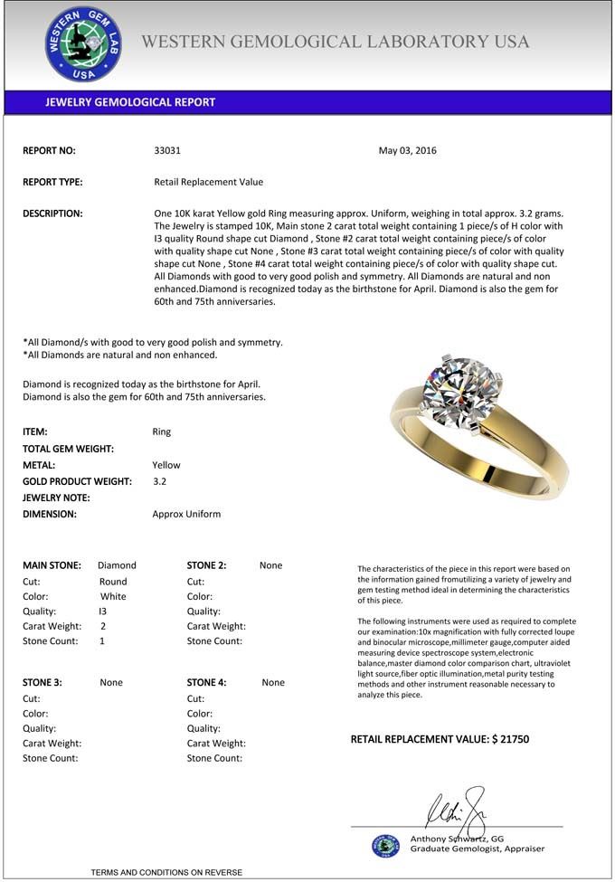 I3 quality Round shape cut Diamond , Stone #2 carat total weight containing piece/s of color with quality