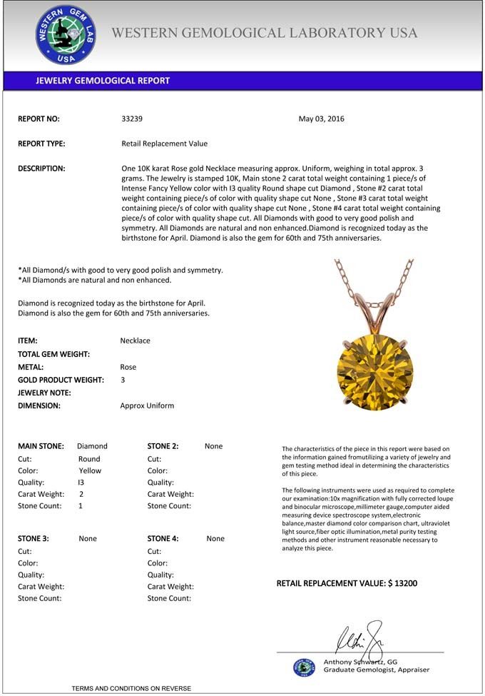 total approx. 3 grams. The Jewelry is stamped 10K, Main stone 2 carat total weight containing 1 piece/s of Intense Fancy Yellow color with
