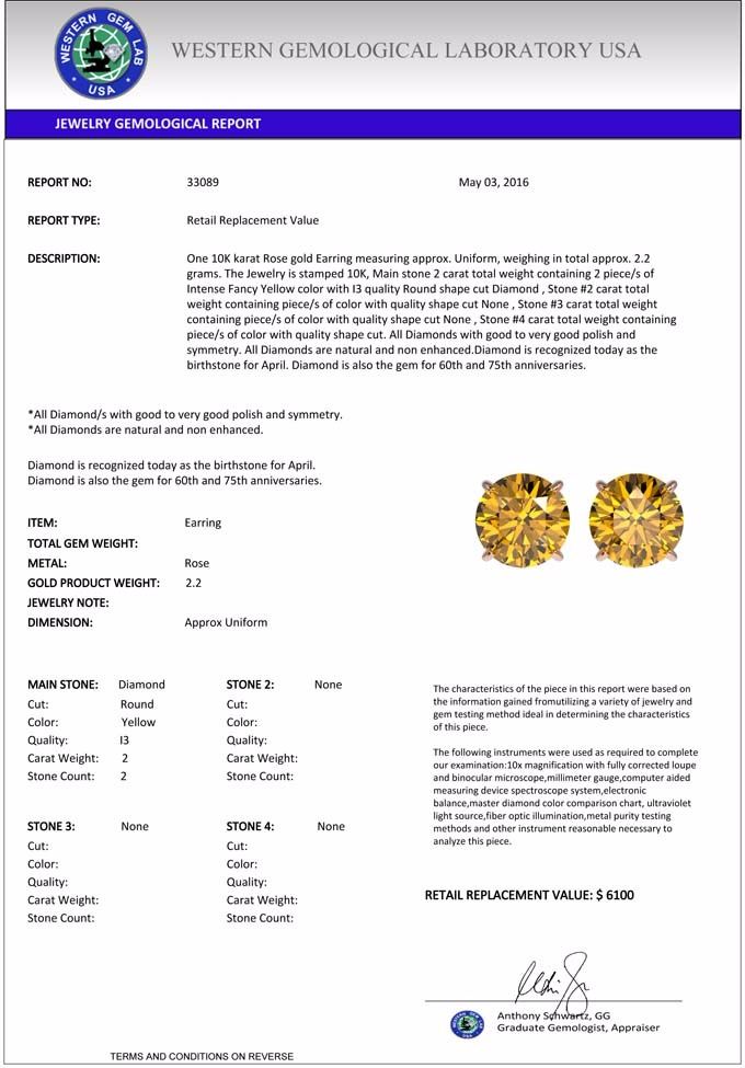 total approx. 2.2 grams. The Jewelry is stamped 10K, Main stone 2 carat total weight containing 2 piece/s of Intense Fancy Yellow color with