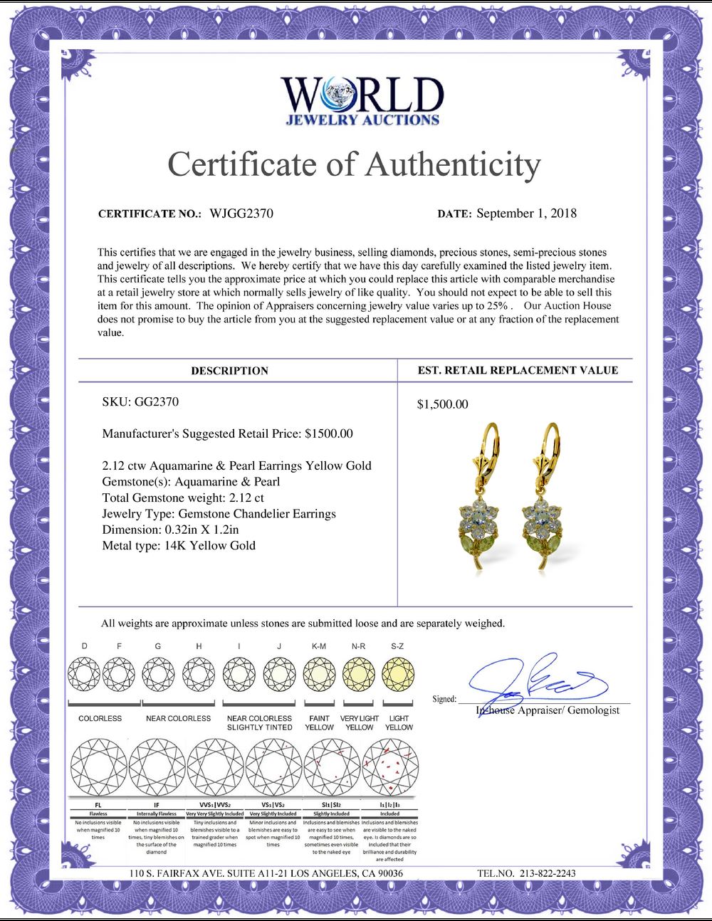 All property is sold “AS IS”, and ALL SALES ARE FINAL. Property is open to thorough public inspection. It is the Bidder’s responsibility to determine condition, age, genuineness, value or any other determinative factor. WJA may attempt to describe the merchandise in advertising and on the Internet but makes no representations. In no event shall WORLD JEWELRY AUCTION be held responsible for having made or implied any warranty of merchantability or fitness for a particular purpose. Bidder shall be the sole judge of value.