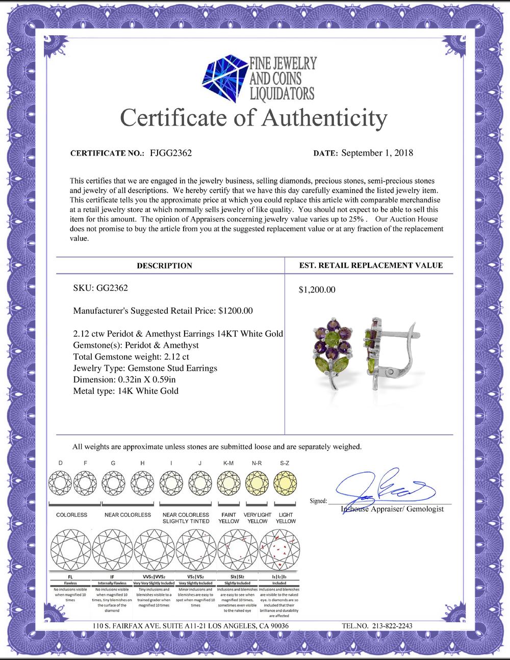 REF-36X8M - SKU: GG2362 ---- Genuine 2.12 ctw Peridot & Amethyst Earrings 14KT White Gold