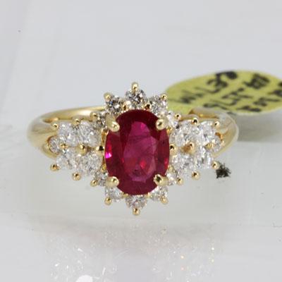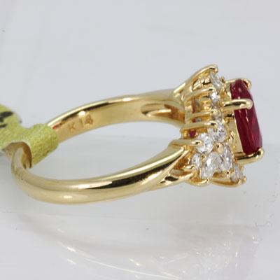 Gemstone: Ruby ; Gemstone Shape: Oval ; Gemstone Size: 8X6 ; Gemstone Weight: 1.39 ; Diamond Count: 12RD ; Diamond Weight: 0.73; Metal Purity: 14KT ; Metal: Yellow Gold ; Ring Size: 6.5