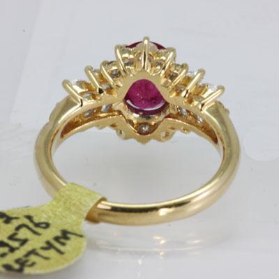 Gemstone: Ruby ; Gemstone Shape: Oval ; Gemstone Size: 8X6 ; Gemstone Weight: 1.39 ; Diamond Count: 12RD ; Diamond Weight: 0.73; Metal Purity: 14KT ; Metal: Yellow Gold ; Ring Size: 6.5