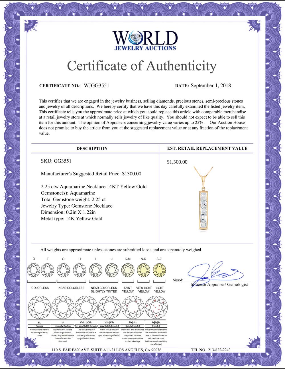 All property is sold “AS IS”, and ALL SALES ARE FINAL. Property is open to thorough public inspection. It is the Bidder’s responsibility to determine condition, age, genuineness, value or any other determinative factor. WJA may attempt to describe the merchandise in advertising and on the Internet but makes no representations. In no event shall WORLD JEWELRY AUCTION be held responsible for having made or implied any warranty of merchantability or fitness for a particular purpose. Bidder shall be the sole judge of value.