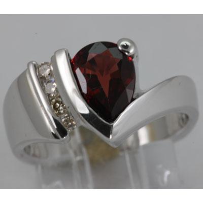 Gemstone: Garnet ; Diamond Count 1: 4RD ; Diamond Weight: 0.14 ; Gemstone Color: Red ; Gemstone Count: 1 Pear Shape ; Gemstone Weight: 2.12 ; Dimension: 9X7MM ; Metal Purity: 14KT ; Metal: Gold-White ; Ring Size: 7