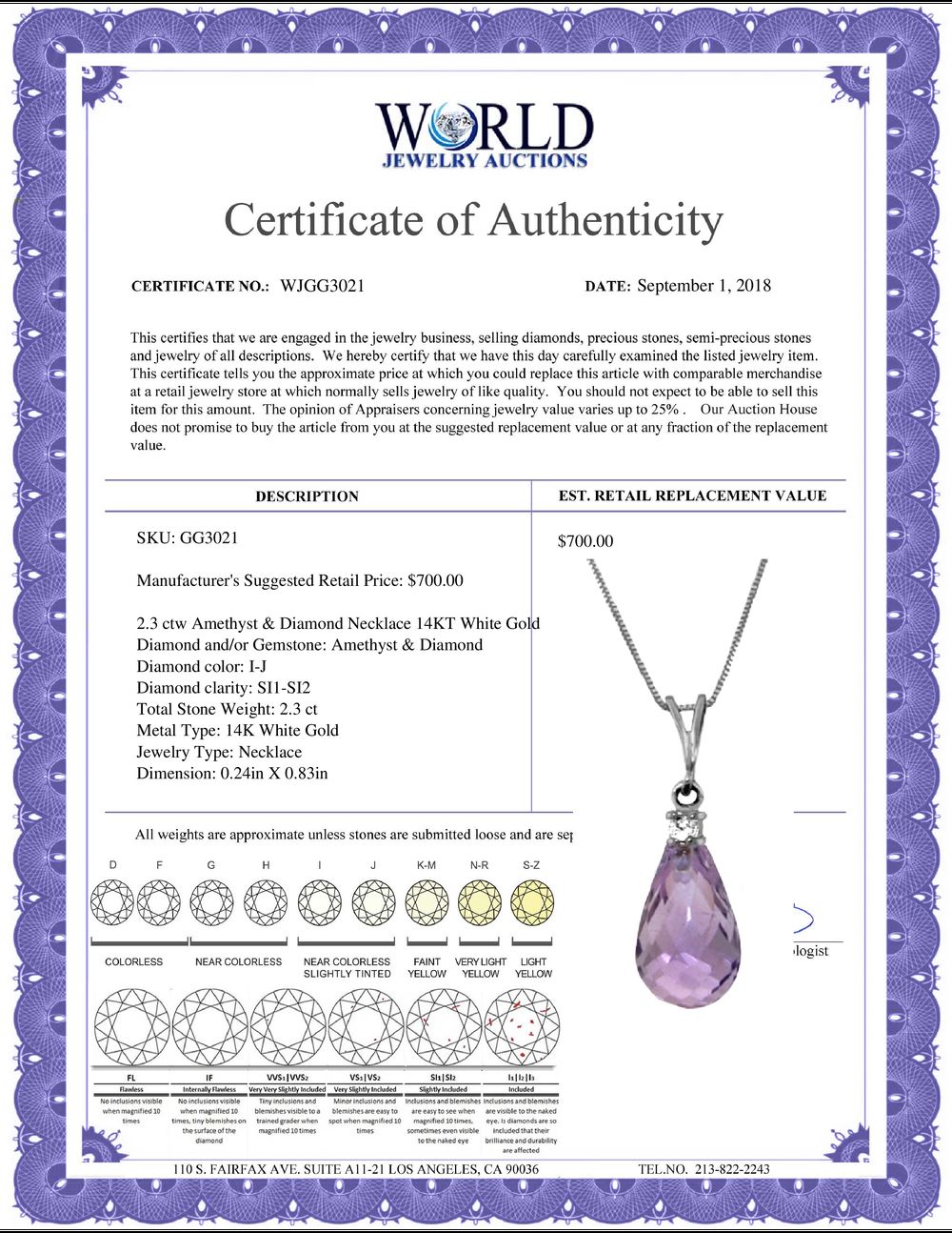 All property is sold “AS IS”, and ALL SALES ARE FINAL. Property is open to thorough public inspection. It is the Bidder’s responsibility to determine condition, age, genuineness, value or any other determinative factor. WJA may attempt to describe the merchandise in advertising and on the Internet but makes no representations. In no event shall WORLD JEWELRY AUCTION be held responsible for having made or implied any warranty of merchantability or fitness for a particular purpose. Bidder shall be the sole judge of value.