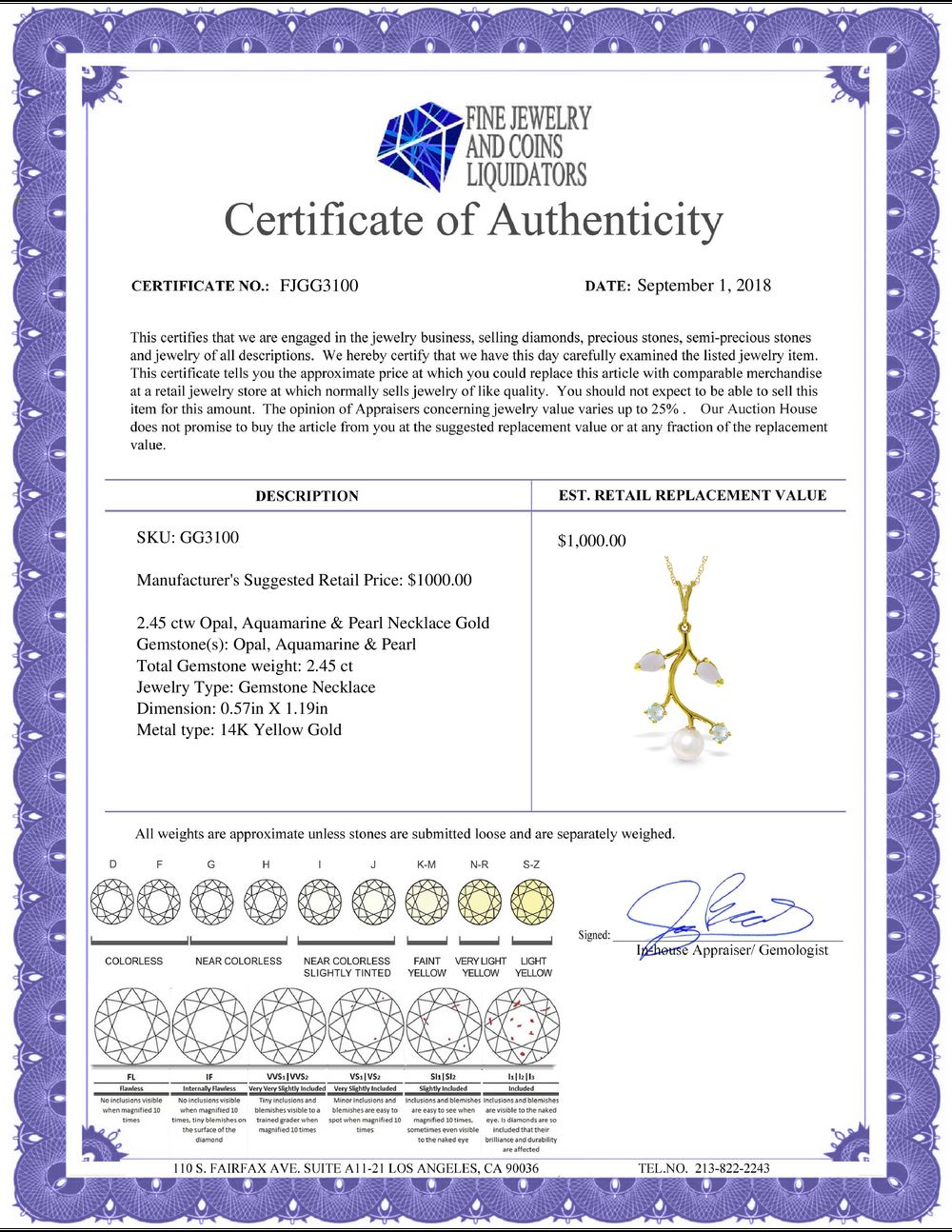 REF-30A2K - SKU: GG3100 ---- Genuine 2.45 ctw Opal, Aquamarine & Pearl Necklace 14KT Yellow Gold
